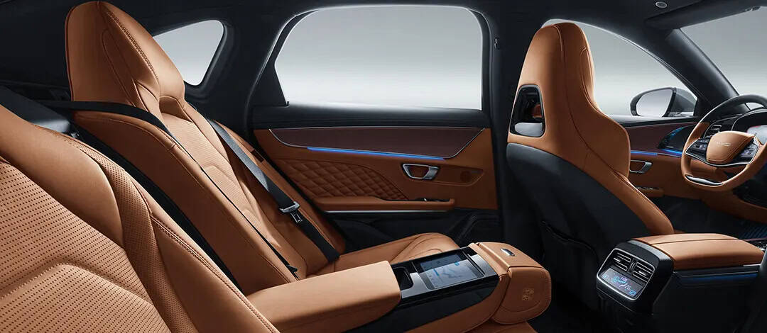 Không gian phía sau sang trọng với chất liệu da Nappa được chọn lọc thủ công, gỗ châu Âu và bảng điều khiển trung tâm sang trọng bậc nhất.